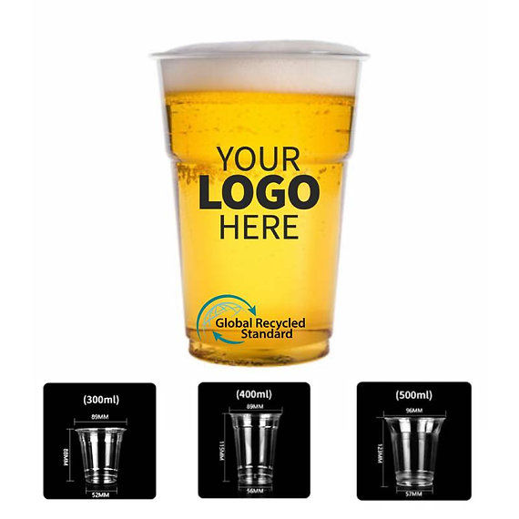 RPET® Ølkrus i klarplast – Med egen logoprofilering i ulike størrelser